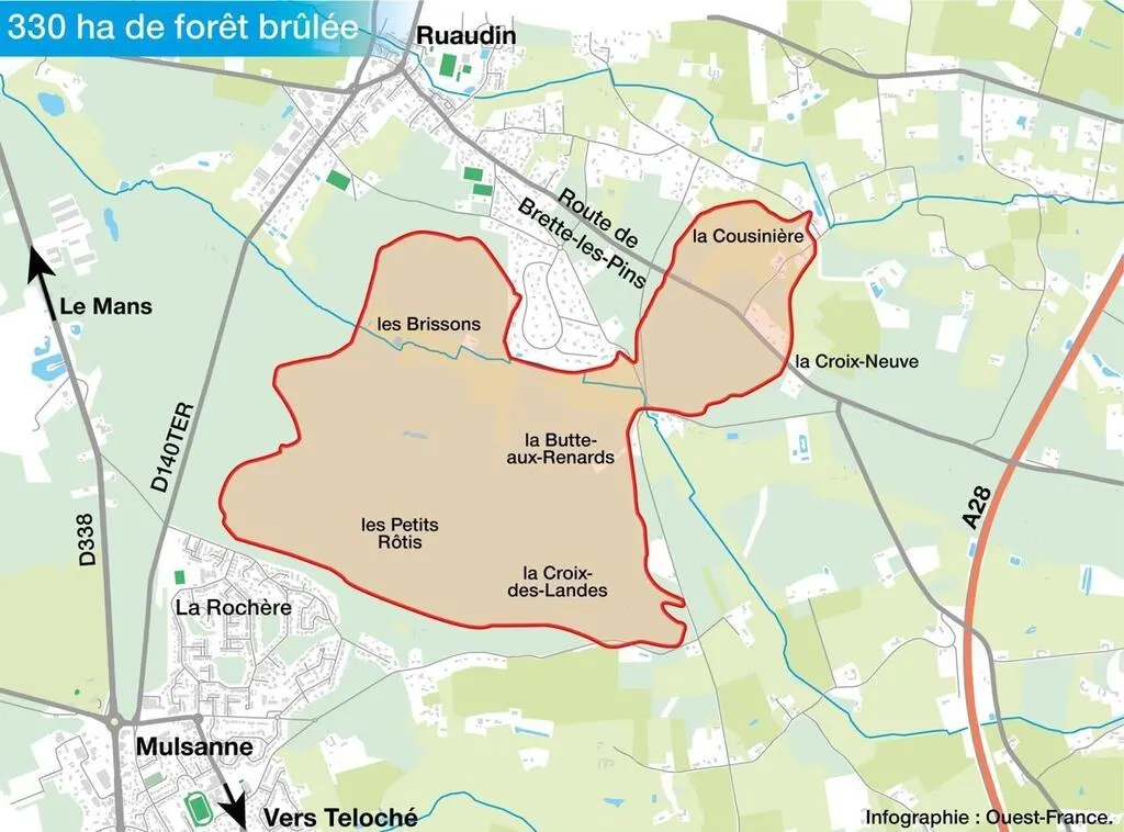 330 hectares de forêts ont brûlé au sud du Mans, en Sarthe. L’incendie, qui a débuté lundi 18 juillet 2022, a principalement touché Teloché, Mulsanne et Ruaudin. Infographie Ouest-France