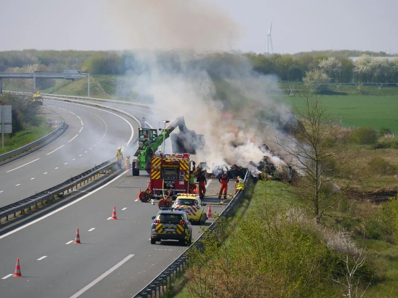 À 14 h 30, notre journaliste sur place constatait qu’une pelleteuse était en action pour évacuer les round-ballers enflammés. Plusieurs dizaines de véhicules étaient à l’arrêt dans le bouchon, et pour patienter, nombreux étaient ceux qui étaient sortis de leur véhicule.
