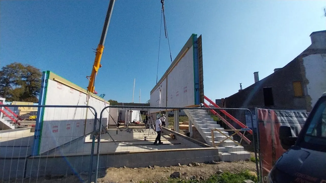 Assemblage d’un collectif de huit logements de La Nantaise d’habitations, en Loire-Atlantique. Les façades ont été fabriquées dans l’entreprise Macoretz, puis livrées sur le site. C’est, notamment, ce type de constructions « hors site » que les organismes HLM de la région veulent commander à très grande échelle. © Macoretz scop