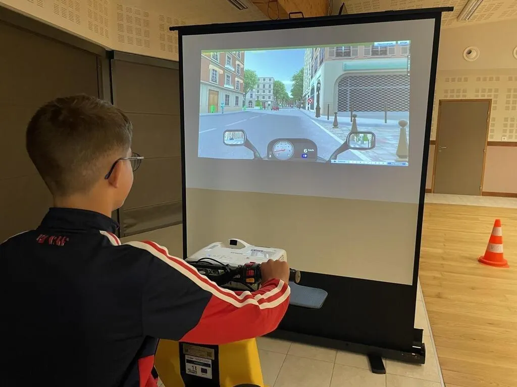 Les élèves se sont installés devant un simulateur avant de conduire un vrai scooter, sur le parking de l’hippodrome. © Le Maine Libre