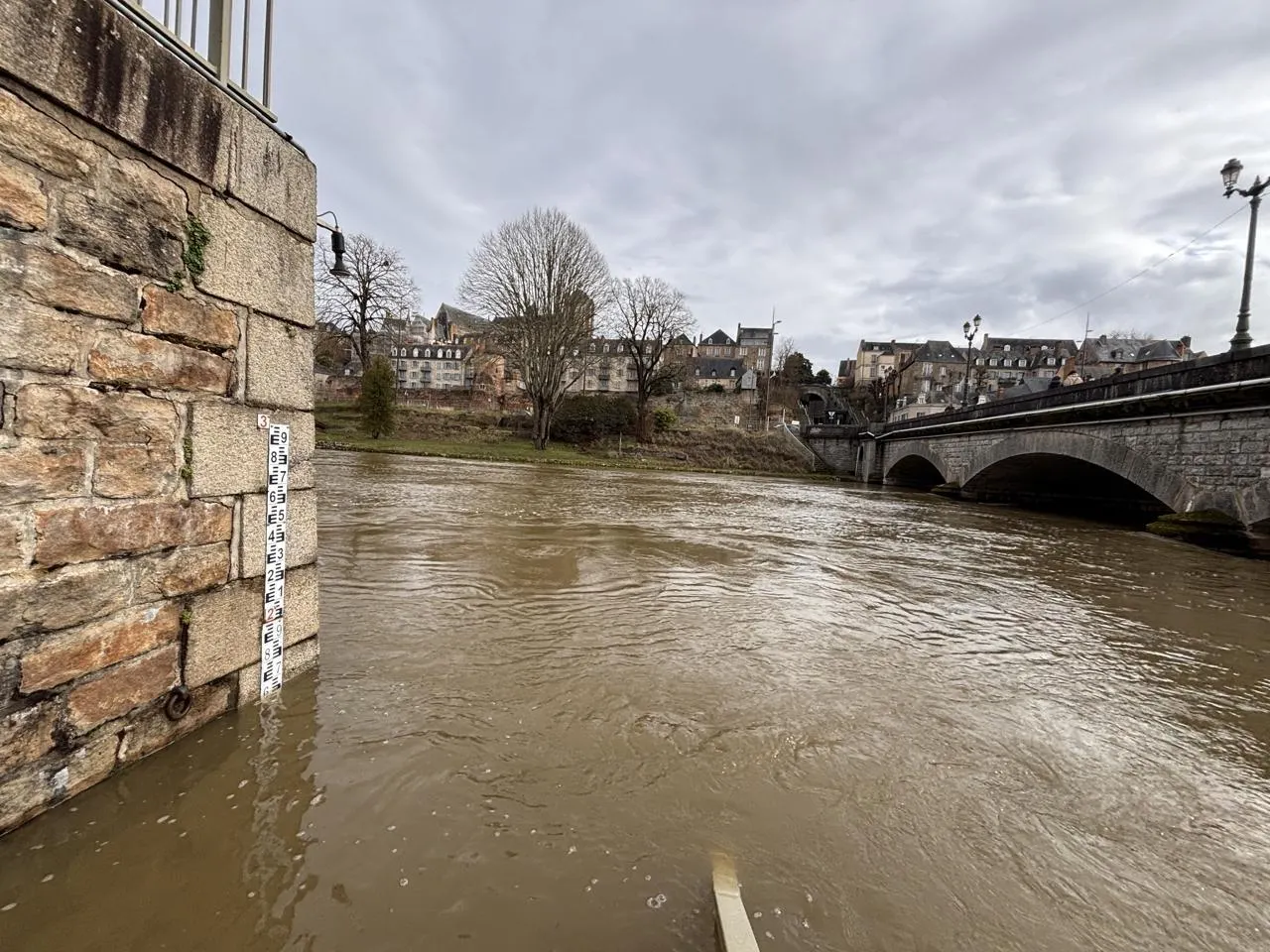 photo ce lundi 16 février 2026, l’échelle de crue du pont yssoir, dans le centre-ville du mans, indiquait une légère décrue après le pic hivernal de la veille.  ©  ouest-france