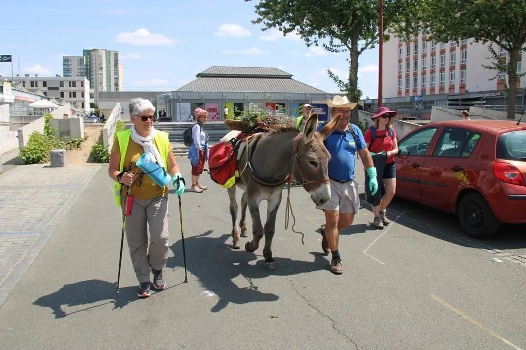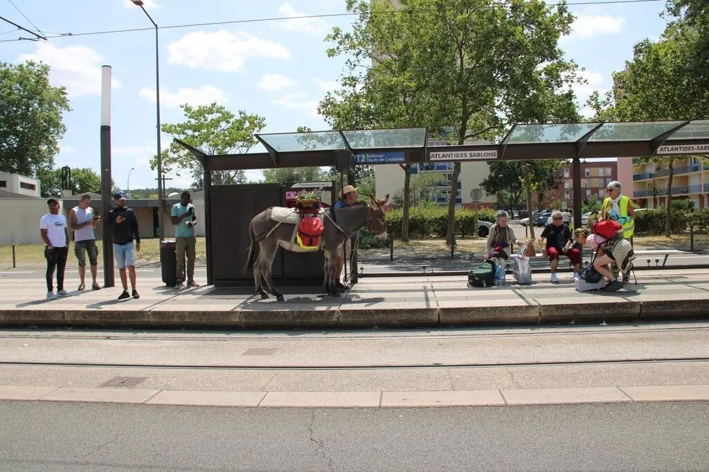 Les pèlerins l’ont détachée pour faire un tour de la place du Marché, déserte. Munis de gants et de sacs-poubelles, les marcheurs ont ramassé les déchets sur leur passage avant de rejoindre la promenade Newton en direction du parc du Gué-de-Maulny. Entre-temps, quelques jeunes hommes attendant le tramway ont sorti leur téléphone pour immortaliser l’ânesse à l’arrêt Atlantides Sablons.