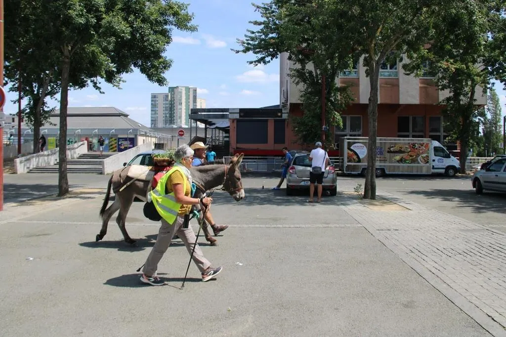 Ce samedi, leur marche les a menés jusqu’au Mans. Vers 12 h 30, ils ont attaché Image à un réverbère pour leur pause déjeuner devant l’église Saint-Bernard des Sablons. Peu avant 14 h, l’ânesse s’est mise à braire d’impatience, attirant l’attention des habitants des tours voisines, sortant la regarder depuis leur balcon, et de quelques passants venus caresser l’animal.