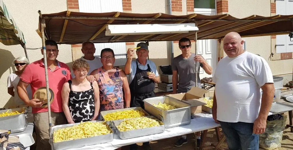 Le président Stéphane Moriceau aux côtés de l’équipe du comité des fêtes, en pleine préparation des frites. © Le Maine Libre