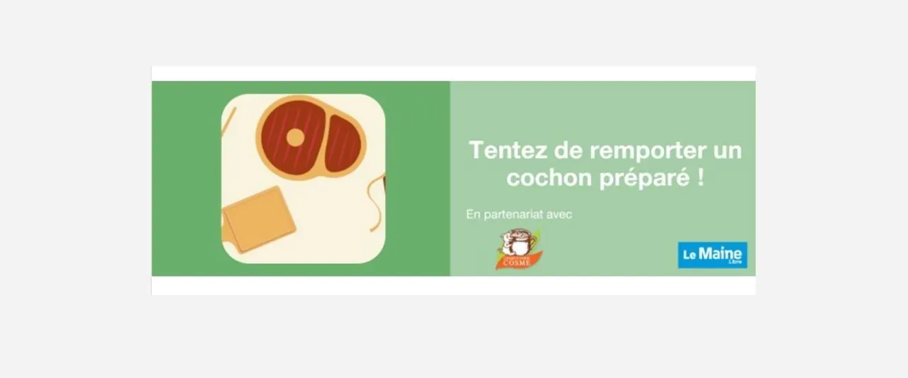 Votre journal vous propose de tenter votre chance en remplissant le formulaire ci-dessous. À gagner un cochon préparé par la charcuterie Cosme, d’une valeur de 400 €, soit plus de 50 kg de viande et de charcuterie : saucisses, pâté, pieds cuits, boudin blanc, rillettes, jambon, filet mignon, côtes de porc.