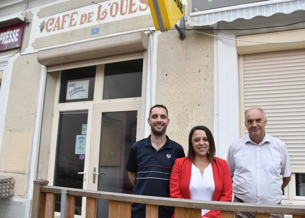 Joanna, la gérante du multiservices, le Café de l’Ouest aux côtés de son conjoint Jonathan et du maire Michel Froger. © Le Maine Libre