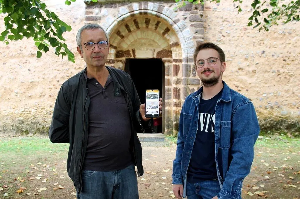 Hervé Delaune, président de l’Association Patrimoine d’Asnières, montre l’application « AppliGuide » avec Maxime Bruant, jeune bénévole du collectif, devant l’église Saint-Hilaire, samedi 18 septembre 2021. © Ouest-France