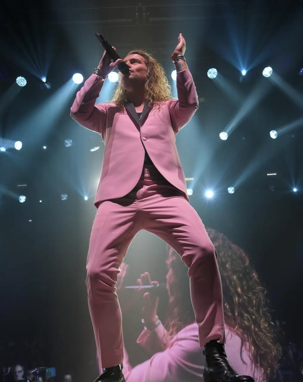 Julien Doré, en costume rose ajusté, a conquis le public d''Antarès avec un vrai show. Photo Le Maine Libre. © Le Maine Libre