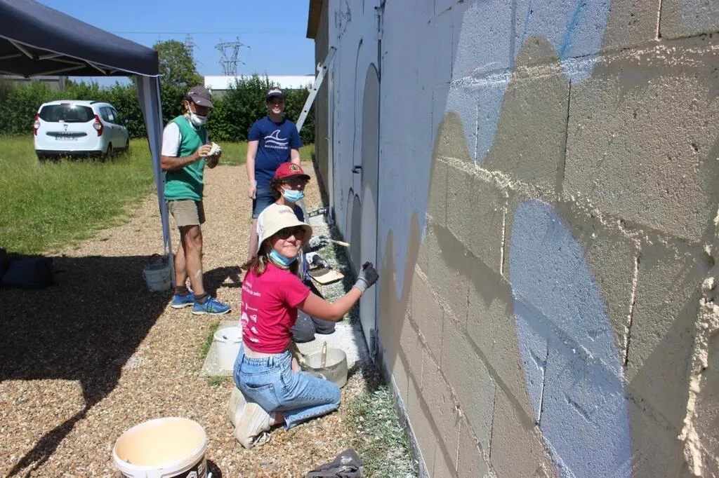 Concernant le vestiaire du stade, c’est Franck Eymon, conseiller municipal, qui s’est chargé d’atténuer l’aspect « bunker » du bâtiment. Pratiquant la calligraphie et l’enluminure, Franck Eymon retrouve sa passion du dessin dans cet exercice de « street art ». Cloé, Louis et Romaric ont été sélectionnés pour participer au relookage (70 m²) du vestiaire.