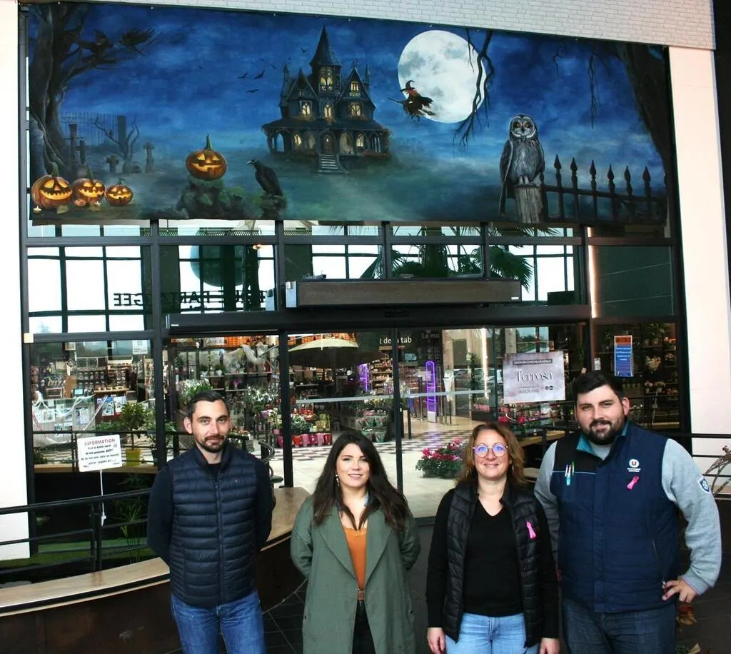Posent devant la fresque de gauche a droite : Maxime Samèle, Émeline Herique, Sandrine Letendard (responsable animations) et Camille Samèle, cogérant du Super U de Sainte-Jamme. © Le Maine Libre
