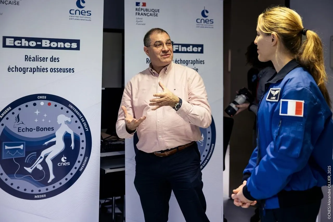 Marc-Antoine Custaud présente l’expérience Echo-Bones à Sophie Adenot. © © CNES/OLLIER Alexandre, 2025