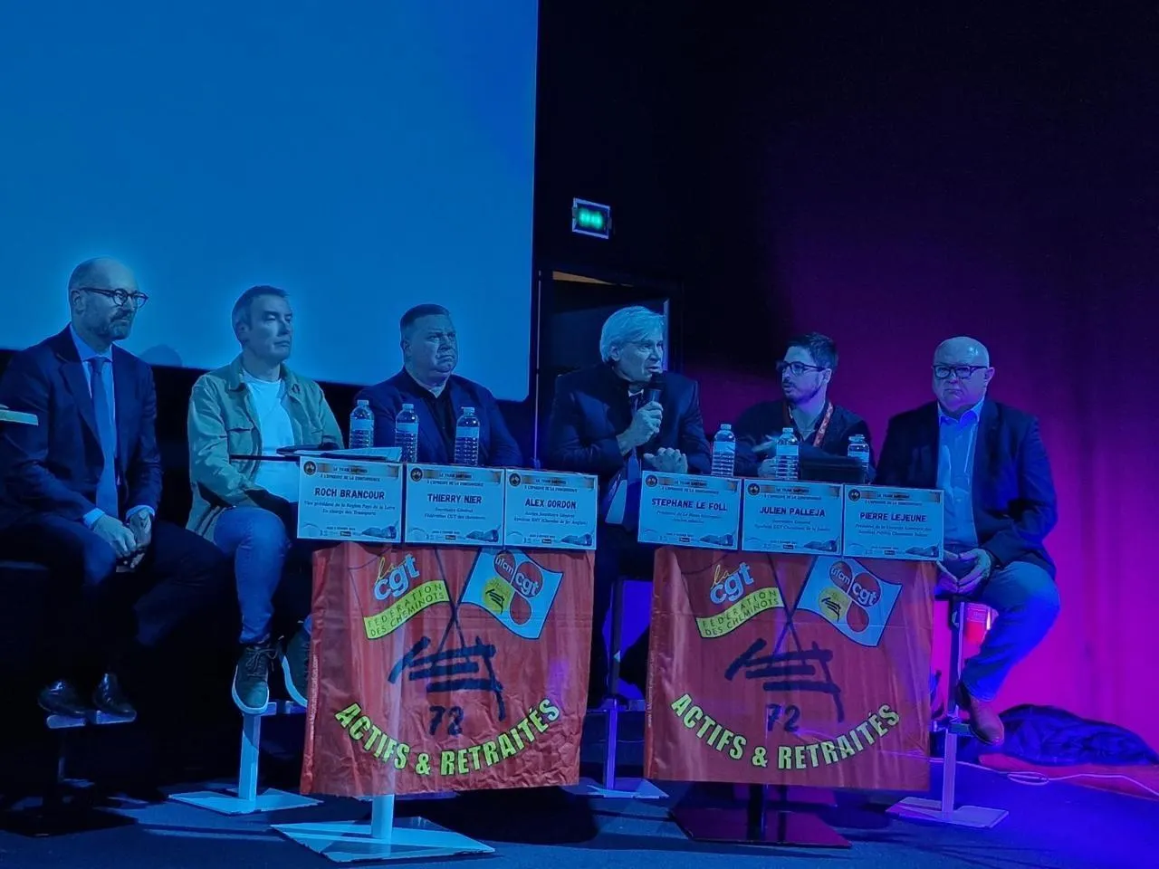 La CGT des cheminots de la Sarthe a organisé une réunion publique à la salle des Cinéastes en compagnie notamment de Stéphane Le Foll et de Roch Brancour. © Le Maine Libre