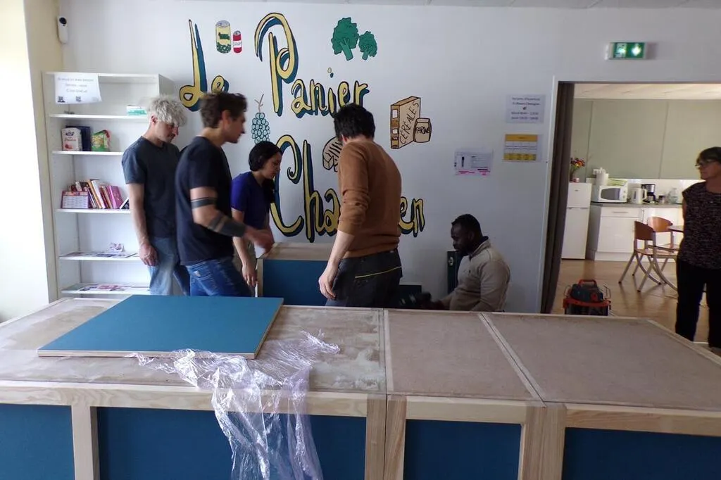 Les personnes en formation au Greta installent le meuble de caisse qu’ils ont réalisé. © Le Maine Libre
