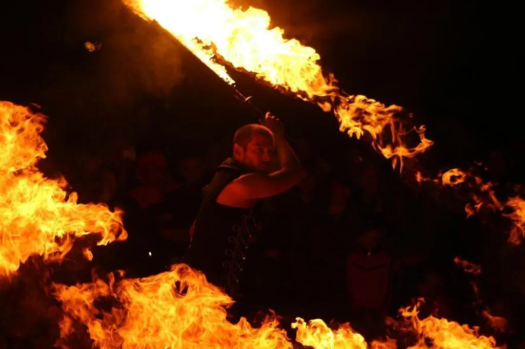 Rémi, de la compagnie C.H.K.1, est spécialisé dans la manipulation d’objets enflammés. Il jouera son spectacle Luminescence mardi 22 juillet 2025 au manoir de la Cour à Asnières-sur-Vègre. © Crédit C.H.K.1
