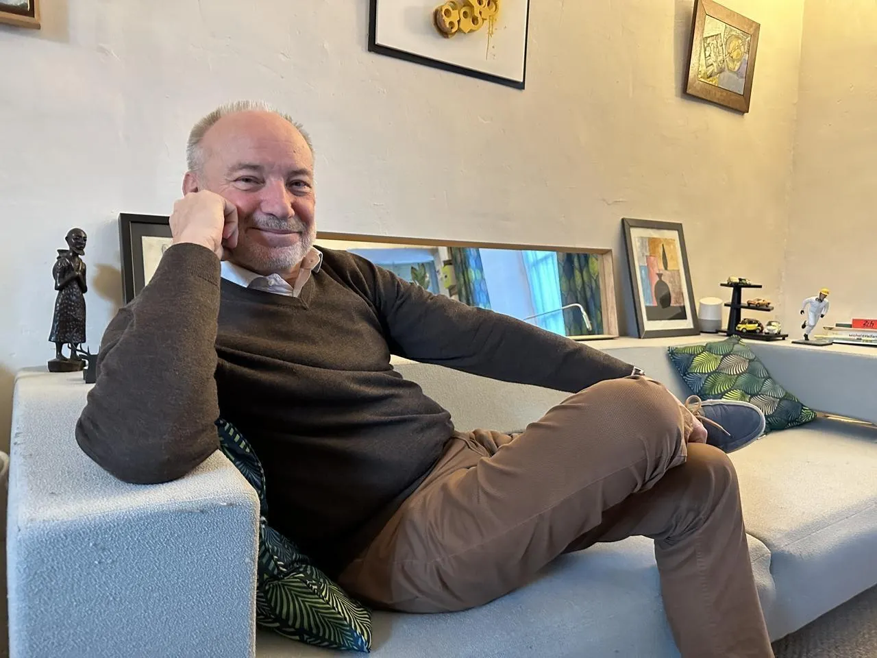 Depuis son canapé à Pontvallain dans le sud Sarthe, Pascal Brûlon raconte son parcours et la création de la télévision de proximité, LMtv Sarthe. © Ouest-France