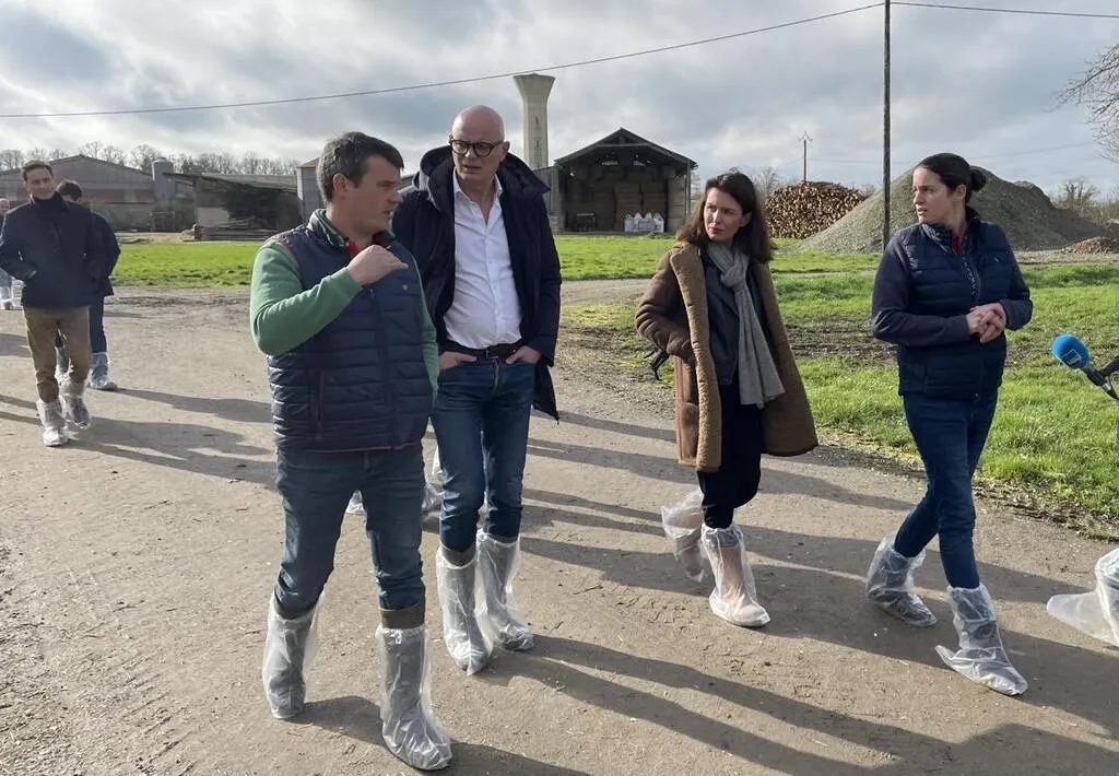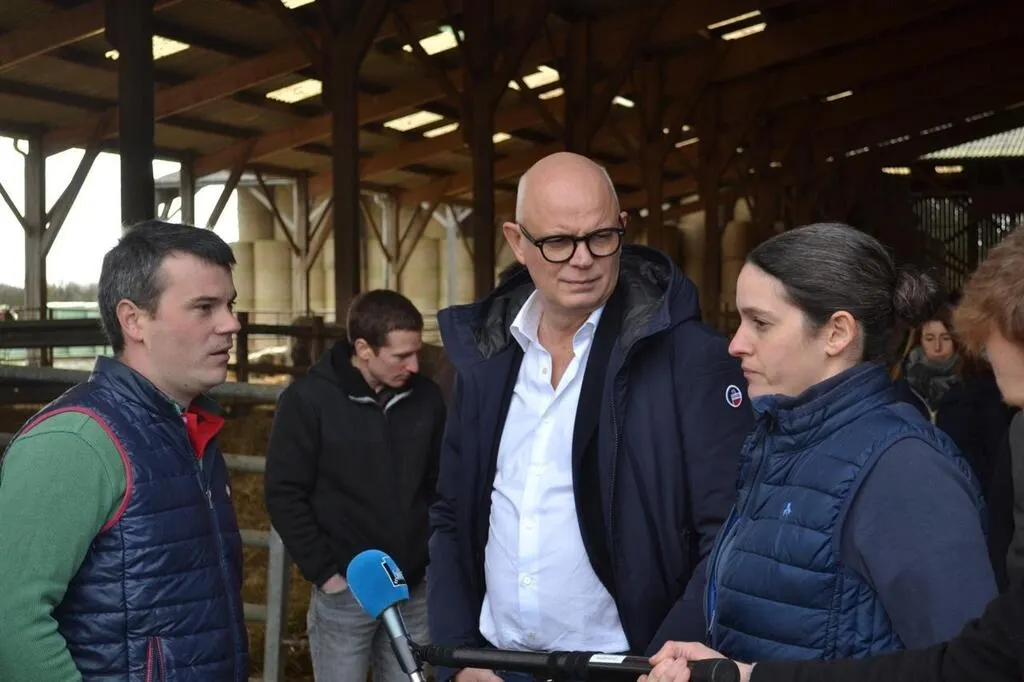 L’ex-Premier ministre Édouard Philippe, président du parti Horizons, était ce mardi 13 février 2024 à Jauzé, en Sarthe, dans l’exploitation agricole d’Adeline et Adrien Langot. © Ouest-France