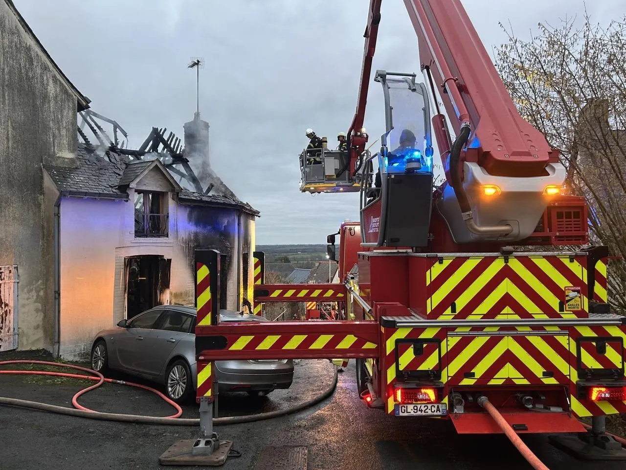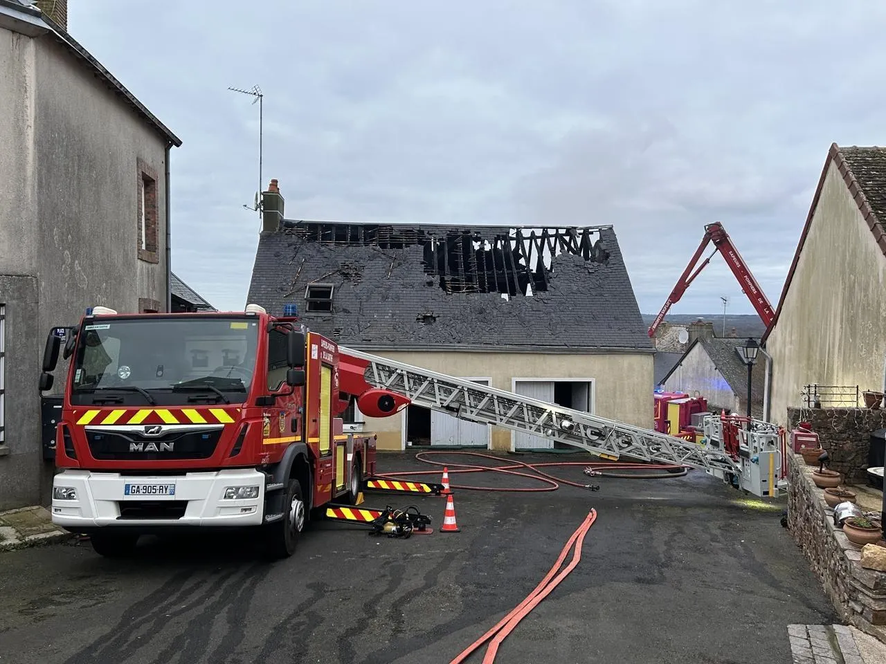 Selon les premiers éléments, le feu s’est déclaré à 5 h du matin ce mardi 30 décembre 2025, dans la maison située au 1, rue de Bellevue à Saint-Denis-d’Orques (Sarthe), la toiture s’est totalement embrasée et effondrée. En raison de l’accessibilité difficile de la maison, d’importants renforts ont été mobilisés par les sapeurs-pompiers.