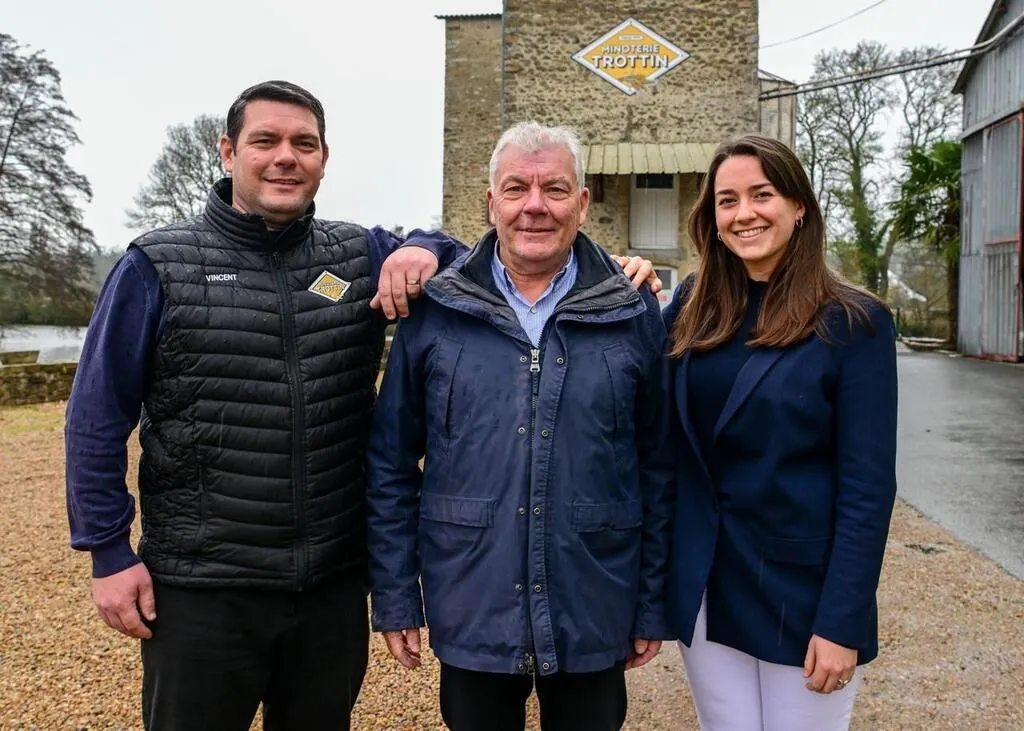 Georges Trottin au milieu de sa fille Claire et de son fils Vincent, à qui il passe progressivement le témoin pour diriger la minoterie familiale. © Le Maine Libre – Yvon LOUÉ