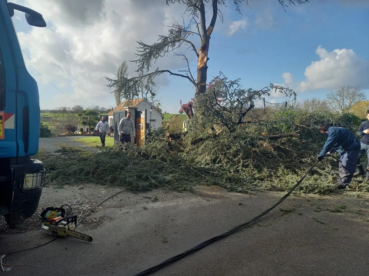 La branche a été sectionnée en plusieurs tronçons mais la circulation reste coupée car un câble électrique a chuté : il traverse la chaussée. A 17 heures, Enedis indiquait que son intervention se terminerait dans la soirée, après deux autres, urgentes.