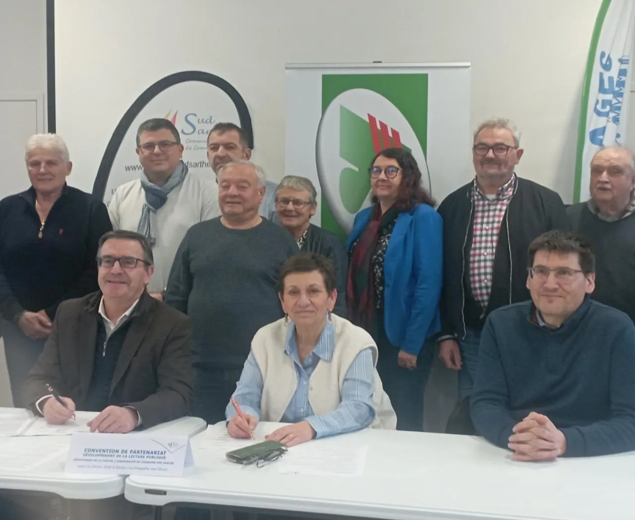 Représentants de Sarthe Lecture, du Département, et élus de la communauté de communes ont renouvelé le partenariat. © Ouest-France