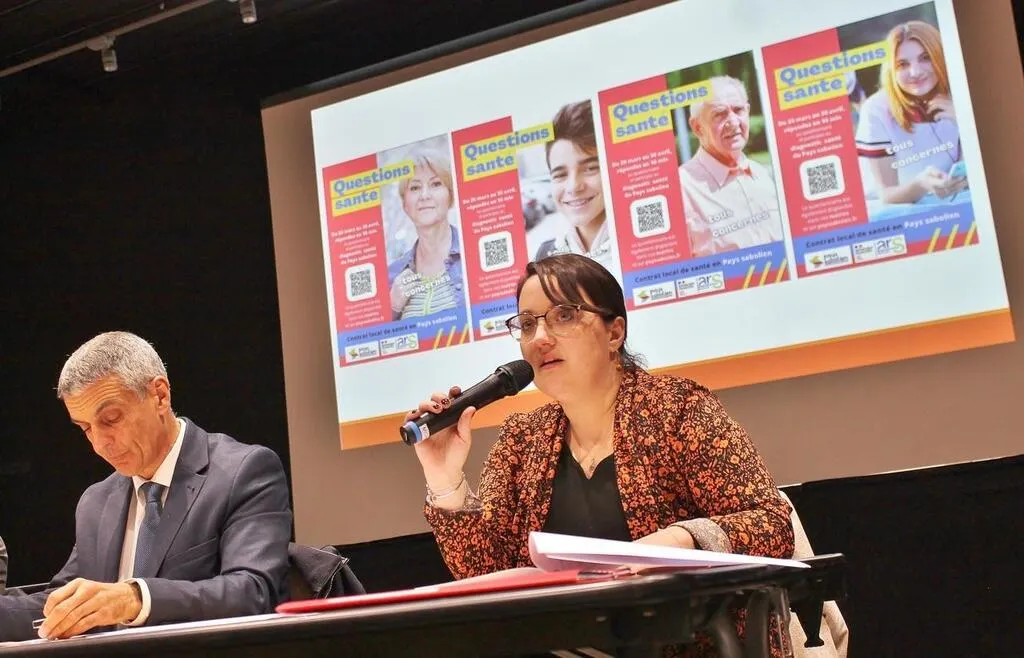Andrea Chauveau, coordinatrice du contrat local de santé, aux côtés de Daniel Chevalier, président du Pays sabolien, ici en mars 2023, à Sablé-sur-Sarthe. © Archives Ouest-France