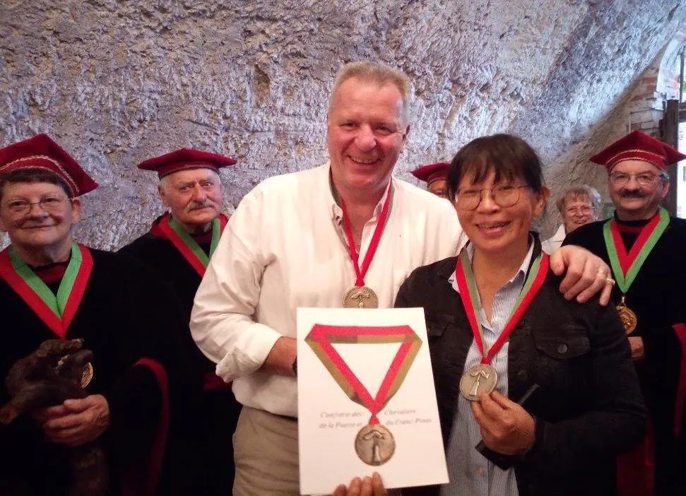 Les chevaliers de la Puette et du Franc-Pinot ont intronisé Xavier Frenot et Naoko Matsumoto-Roquet. © Ouest-France
