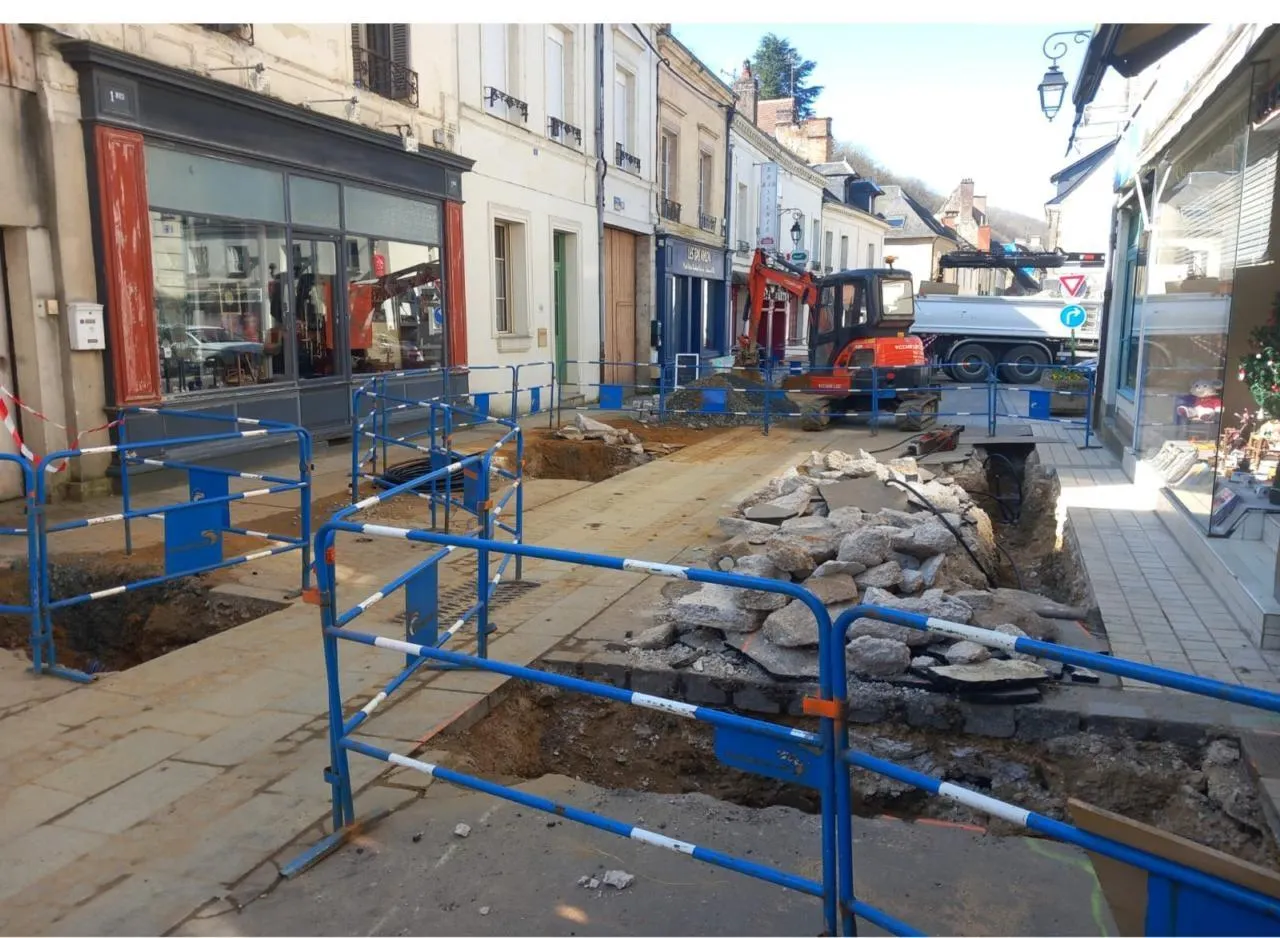 Le chantier rue Nationale est arrivé à la phase délicate des compteurs d’eau individuels. © Le Maine Libre