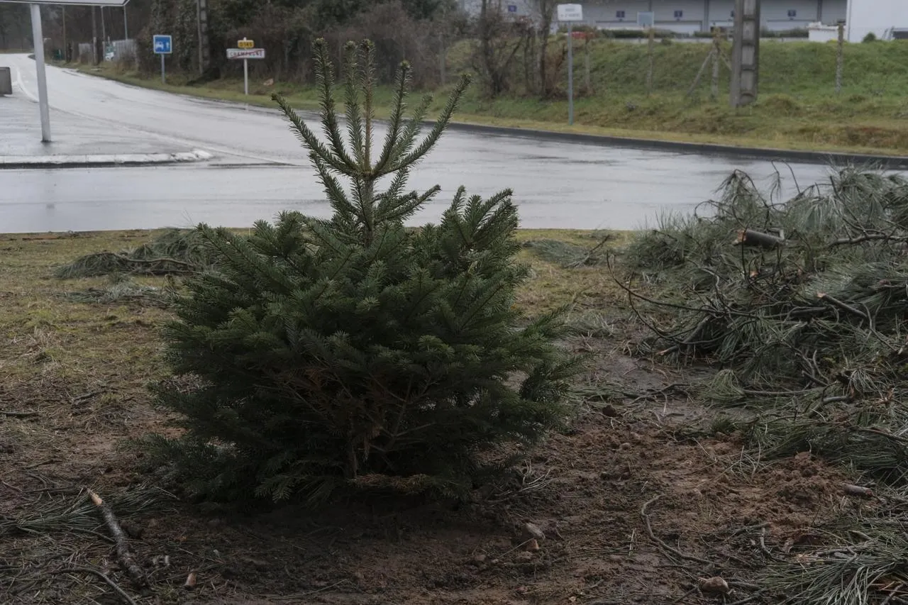 Des agriculteurs de la Coordination rurale 72 ont planté plusieurs sapins sur un rond-point à Champagné (Sarthe), mardi 27 janvier 2026, après l’abattage quelques jours plus tôt d’un arbre en marge d’un rassemblement organisé par le syndicat. © Ouest-France