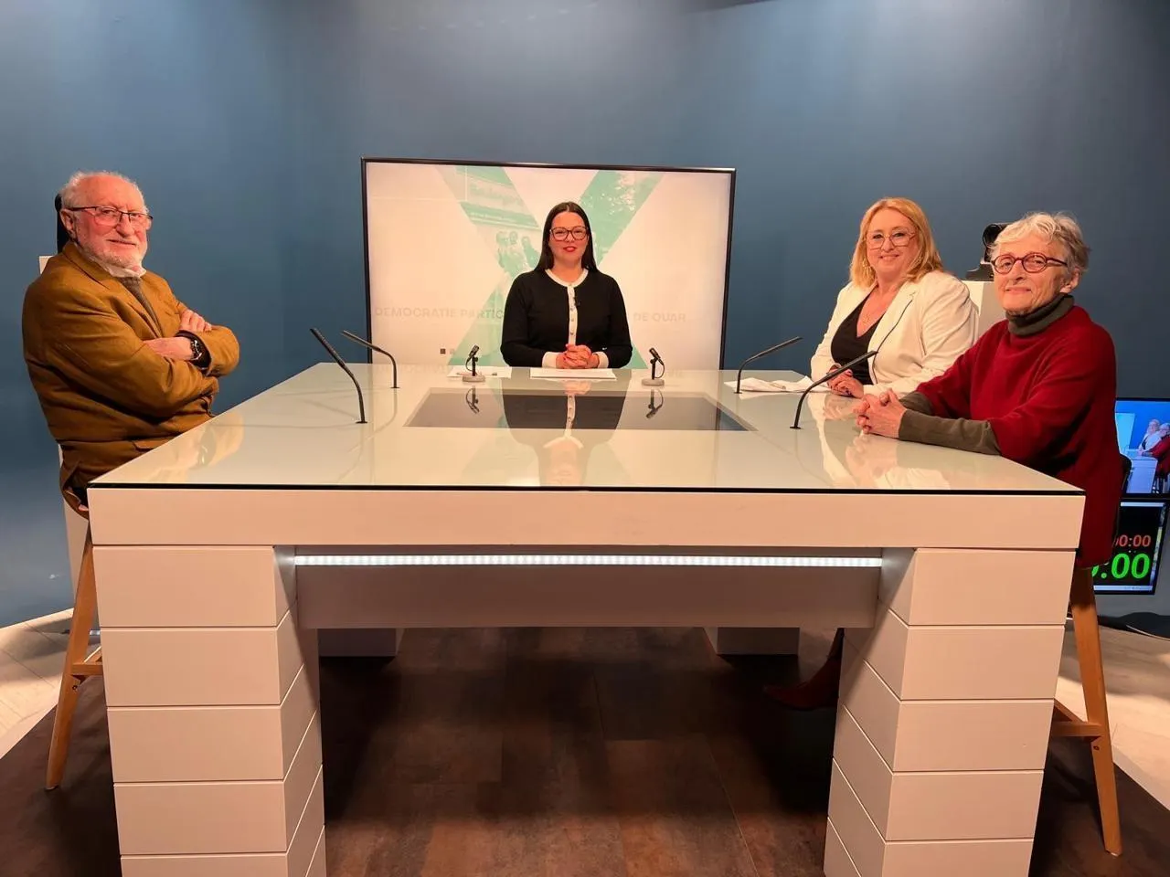 Jean-Pierre Mengeon, président du conseil des sages du Mans, Céline Hemam-Dessam, adjointe déléguée à l’enfance, à la jeunesse, au droit des jeunes, à l’éducation populaire et au droit aux vacances pour la ville d’Allonnes et Annette Coudray, présidente du conseil des quartiers ouest du Mans, autour de Laure Girard, rédactrice en chef de LMtv. © LMtv Sarthe