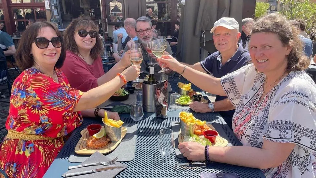 À la terrasse du bar-restaurant du Marais dans le centre-ville de La Ferté-Bernard, ces amis ont profité du soleil pour se retrouver autour d’un bon repas. © Le Maine Libre