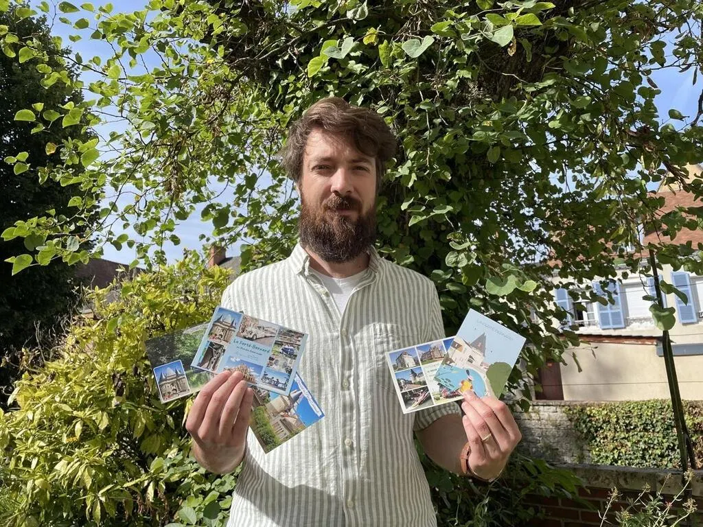 Clément Vincent tient dans ses mains les nouvelles cartes postales touristiques disponibles à l’office de tourisme. © Le Maine Libre