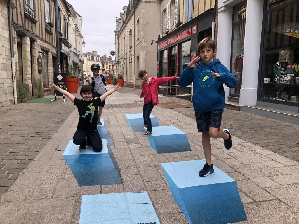 La « Rue des Couleurs » version été 2022 / rue piétonne à La Ferté-Bernard, et ses effets en 3D. © Archives Le Maine Libre