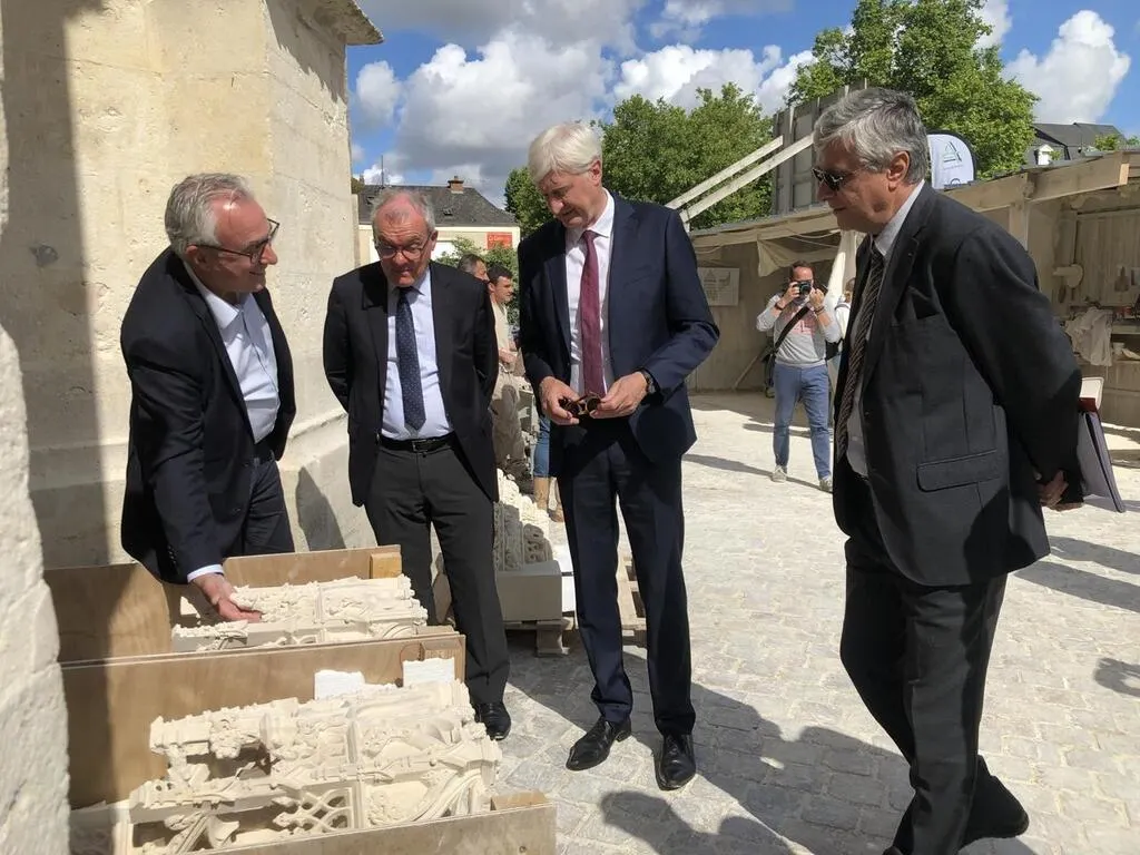 Derrière les grandes palissades qui protègent le chantier de l’église Notre-Dame-des-Marais, des visiteurs d’un jour découvrent l’avancée des travaux ce vendredi 1er juillet 2022. Président du Département, député, conseiller régional, maire, représentante de la Direction régionale des affaires culturelles (DRAC) et architecte des Bâtiments de France sont venus pour le retour de deux dais sculptés, des ouvrages de pierre disposés au-dessus des statues.