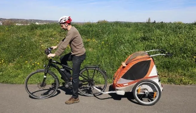 Gregory Alavoine et son épouse possèdent un vélo électrique capable de tirer une remorque de 60 kg dans laquelle ils installent leurs enfants pour aller à l’école ou encore faire leurs courses © Ouest-France