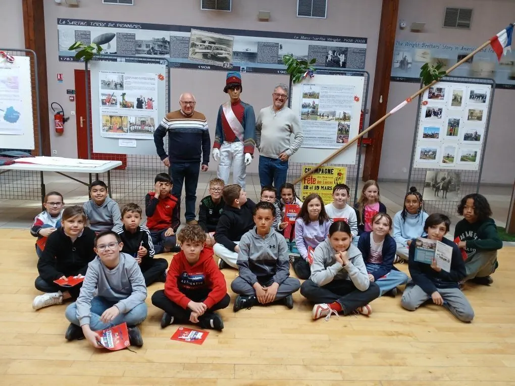 Robert Pautonnier et Philippe Véron, anciens lanciers, ont présenté la Fête des lances de Champagné (Sarthe) aux élèves de CM2, jeudi 3 avril 2025, dans le cadre du passeport du civisme.
