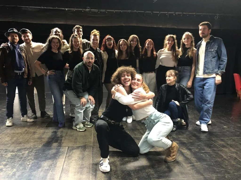 Au centre de la troupe, Tony Teixeira et Lisa Godet?, qui interpréteront le couple de futurs mariés. © Le Maine Libre