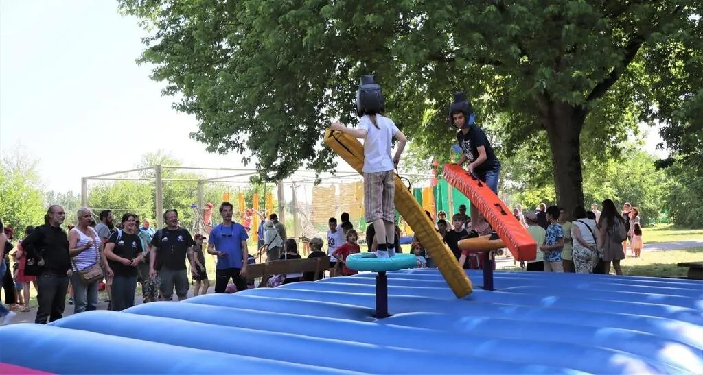 À quelques mètres de là , une petite file d’attente s’est formée pour s’essayer à de la joute bon enfant sur une structure gonflable. Max tente de résister aux assauts de son adversaire, sous les yeux de Delphine, sa maman : « On est plutôt là pour la découverte et le loisir, mais les enfants adorent ! » explique la maman.