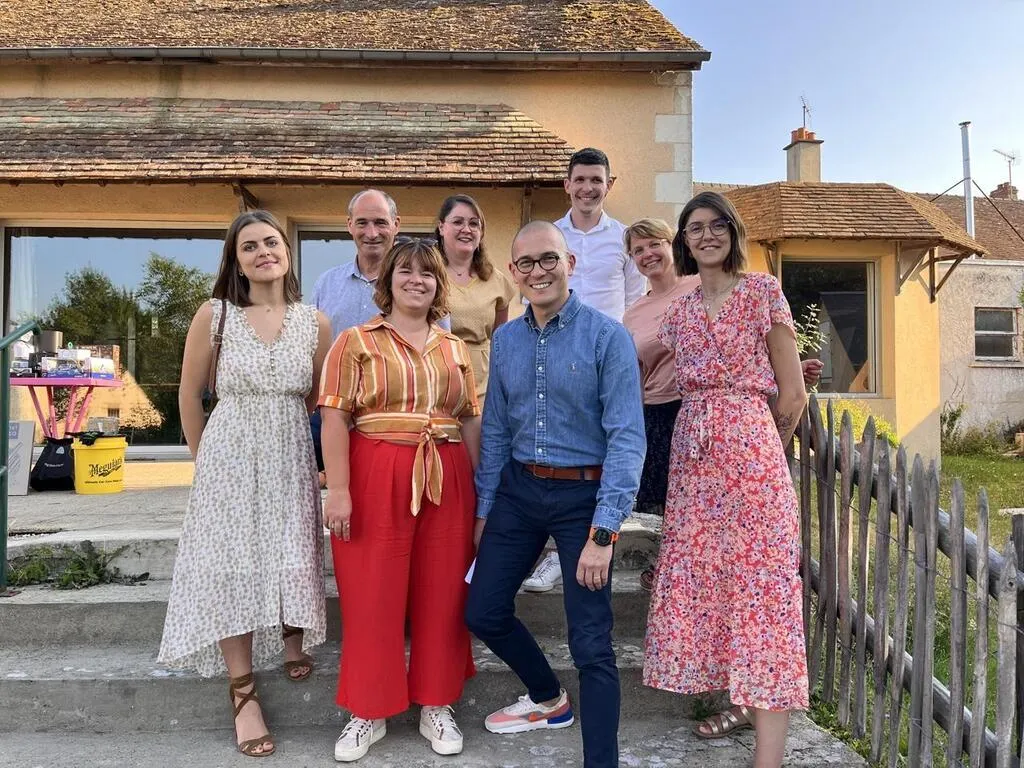 Les membres du conseil d’administration d’Anim’en Flech avec Ugo Franchet, salarié de l’association, et Noémie Vaidie, agente de la communauté de communes du Pays fléchois (CCPF), lors de l’assemblée générale au moulin de la Bruère le 6 juillet © . Ouest-France