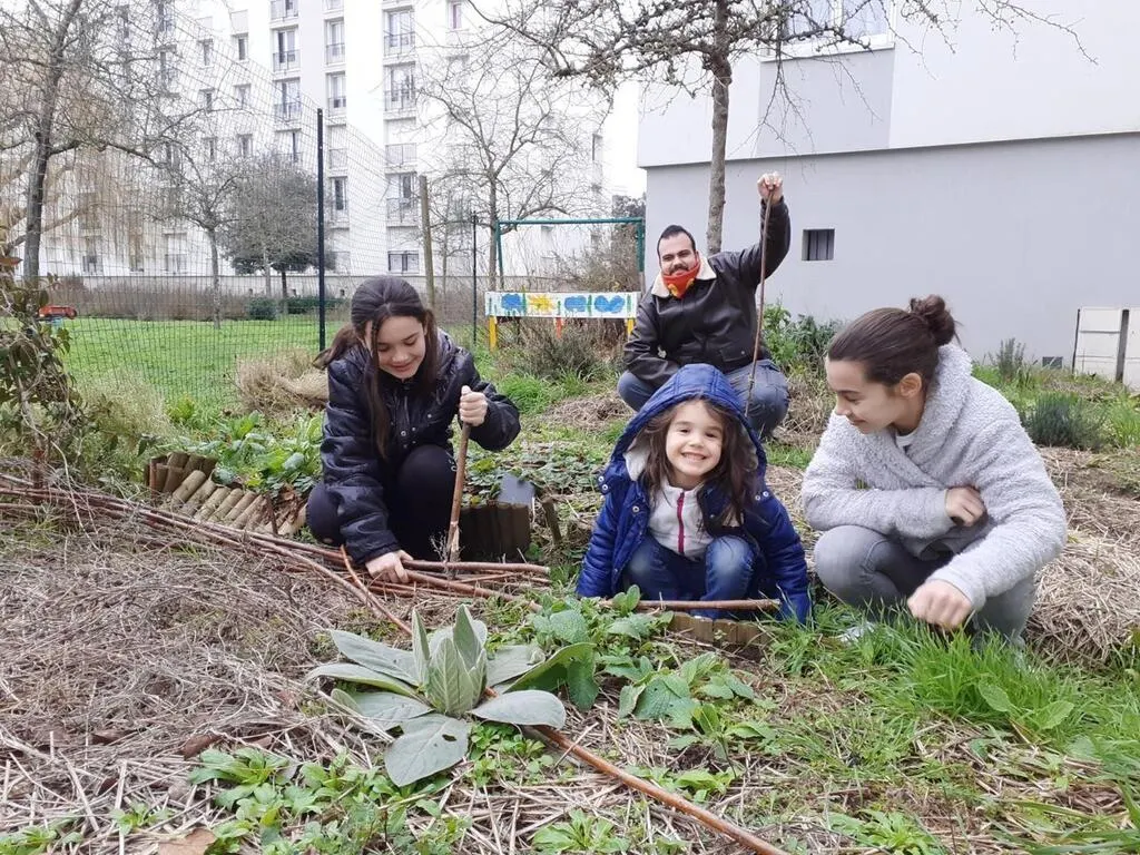 Rebecka, Elena et Gwénaëlle Bigard-Pierre avec l’animateur Romain Métivier, au potager participatif du quartier des Fleurs à La Flèche, mercredi 25 janvier 2023. © Le Maine Libre