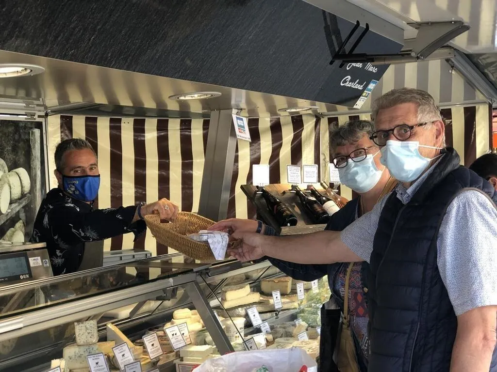 Le fromager Jean-Marc Charland (à gauche) sert Christian et Pascale Pommier (à droite), deux habitués du marché de La Flèche. © Ouest-France
