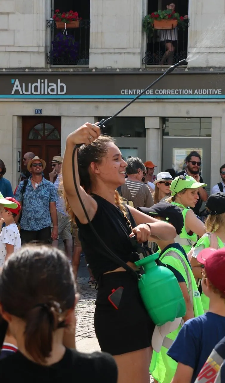 Des bénévoles comme Gwendoline, étaient là pour arroser les festivaliers sous les fortes chaleurs. Ouest-France