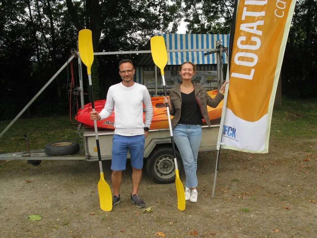 Le club de canoë-kayak de La Flèche, représenté ici par Régis Pineau, coprésident du club, et Alice, saisonnière, propose de nombreuses activités pour l’été. © Ouest-France