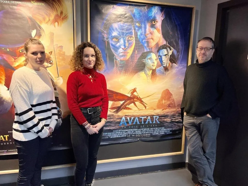 Avatar 2, le film qui explose les scores et sauve la fin d’année du cinéma Le Kid de La Flèche, avec ses plus de 4 000 entrées en deux semaines. De gauche à droite, une partie de l’équipe du cinéma, Fantine Roques, Manon Bernard et Patrice Guittet. © Ouest-France