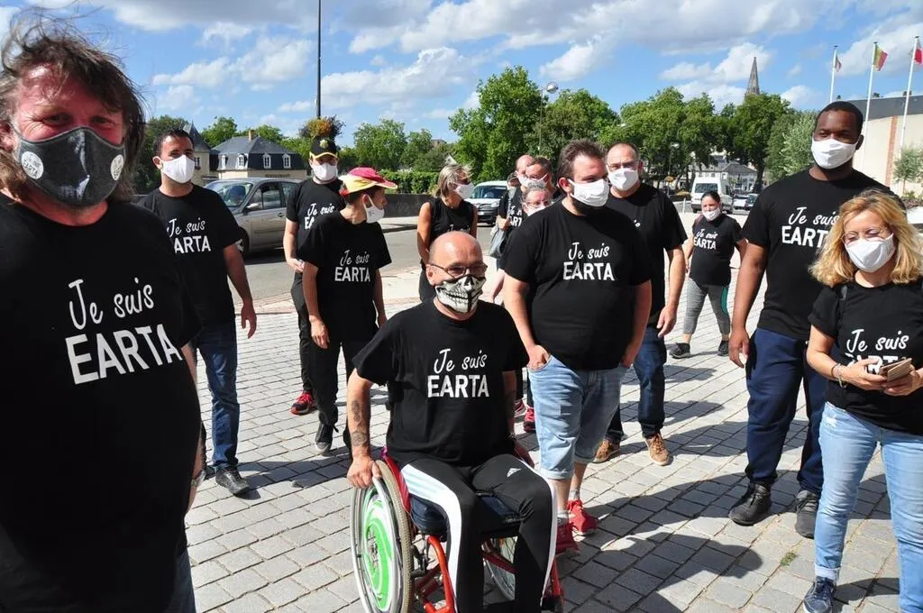 T-shirt noir floqué « Je suis Earta » sur les épaules, ils sont arrivés à la mairie de La Flèche vers 16 heures ce vendredi 21 août. Une vingtaine de salariés de cette entreprise adaptée qui emploie 150 personnes au Mans et à Voivre-lès-Le-Mans, et une centaine en Loire-Atlantique. Des guerriers et des guerrières