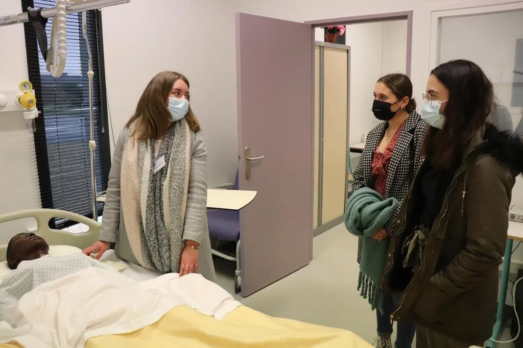 Dans une chambre de l’Ifsi de La Flèche où ont lieu les travaux pratiques, Clarisse (à gauche), en troisième année, présente l’école à deux terminales, samedi 29 janvier 2022. © Ouest-France