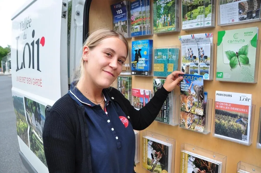 Polo bleu nuit logoté « Vallée du Loir » sur les épaules, Fanny Gouet est à l’accueil du bureau de l’office de tourisme ce jeudi. C’est l’une des deux journées de la semaine, avec le lundi, que la jeune femme âgée de 21 ans passe dans les locaux situés à la gare routière de La Flèche. Le reste du temps, cette Telochéenne joue les nomades dans les villages du sud Sarthe pour aller au contact des touristes et des habitants.