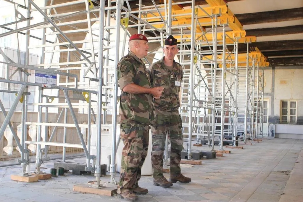 Les travaux dans le Péristyle et la bibliothèque lancent cinq années de grands chantiers au Prytanée. Ici, les lieutenants-colonels Gauthier et Allard de Grandmaison. © Le Maine Libre