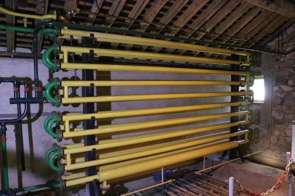 Compresseur, condensateur, détendeur, tout est alimenté avec l’électricité produite par la roue du moulin. Le gaz qui circule dans les tuyaux refroidit peu à peu un bain de glycol (liquide qui gèle autour de -20 °C) dans lequel vont congeler les quelque 90 moules de 20 litres d’eau potable. « La mairie voulait qu’on fabrique de la glace comme à l’époque, explique Michel Ducreux, président de l’association des Amis du moulin de la Bruère. Seulement maintenant, on ne fabrique plus qu’environ 5 tonnes de glace par an tandis qu’avant, c’était 10 tonnes par jour. »