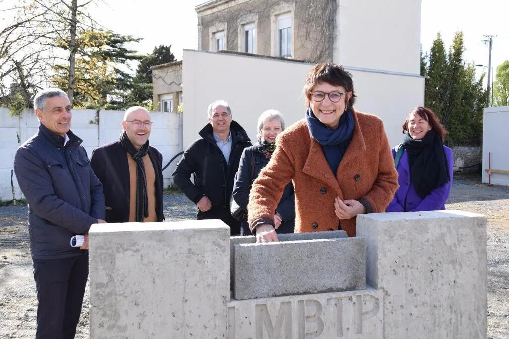 La pose de la première pierre, par Nadine Grelet-Certenais, de ce futur microquartier construit sur le site de l’ancienne école Latouche. 35 logements locatifs sociaux vont y sortir de terre d’ici ces deux prochaines années. © Ville de La Flèche