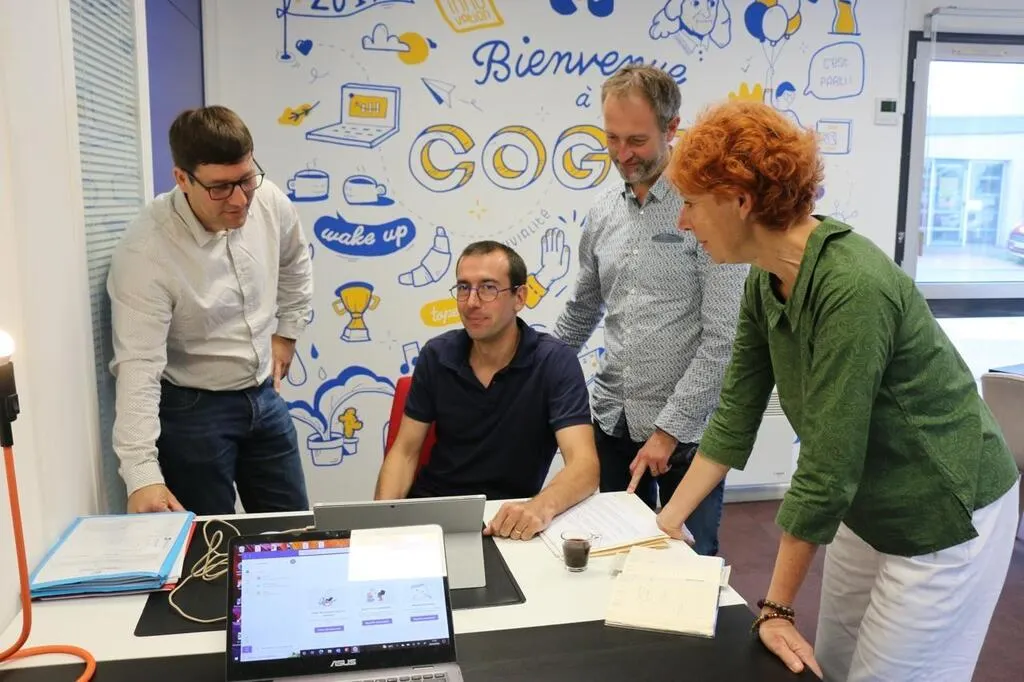 À La Flèche, dans l’enceinte de Cogito, un espace de travail partagé est le repaire des « coworkeurs », ces travailleurs indépendants. Ici, Olivier Cavaillès, Stéphane Bouvier, Gonzague Prouvost et Valérie Hammentien-Mandeville. © Ouest-France